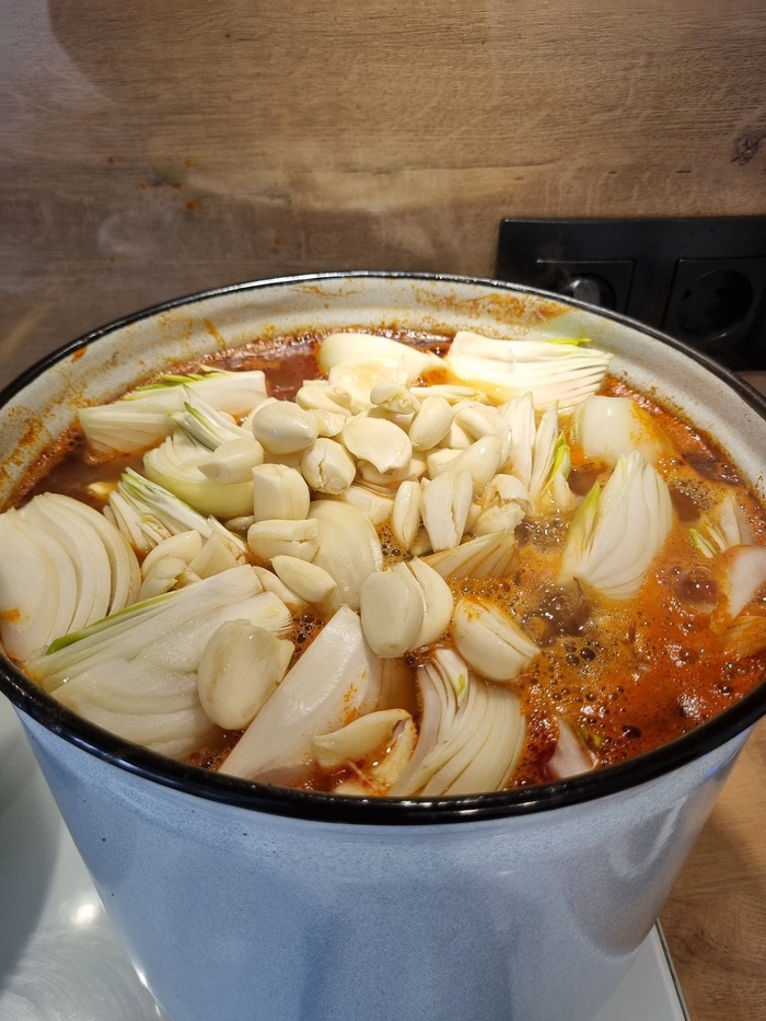 После того, как мы всё запекли - набираем в кастрюлю воды. Мне надо было 9 литров, но влезло только 7,5, поэтому, я в процессе варки добавлял еще, чтобы всё проварилось. Так как у вас будет количество поменьше, я напишу внизу "правильную раскладку".