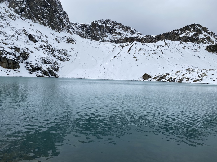 Озеро глубокое, 17 метров. Бирюзового цвета, за счёт того, что ледники перетирают камни в микроскопическую кварцевую пыль, которая затем оседает на дно и отражает свет, из-за чего получается такой цвет. Вот с таким видом на озеро мы и поставили палатку. Привал.