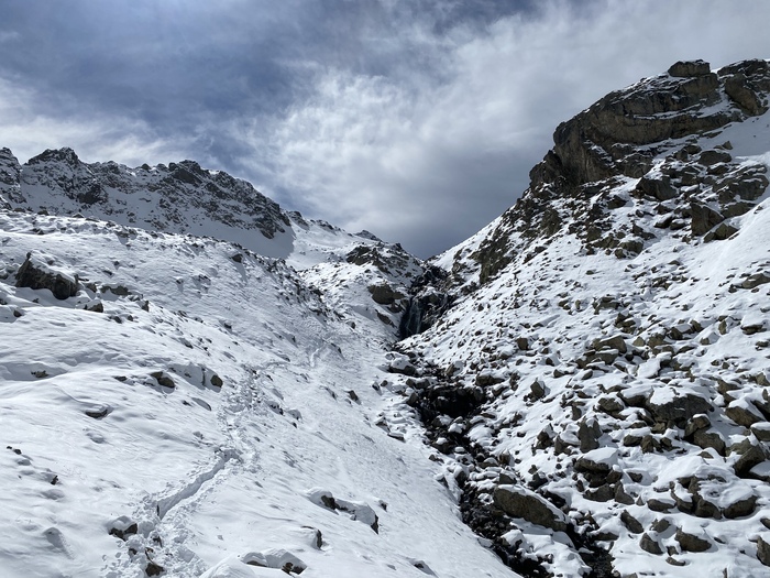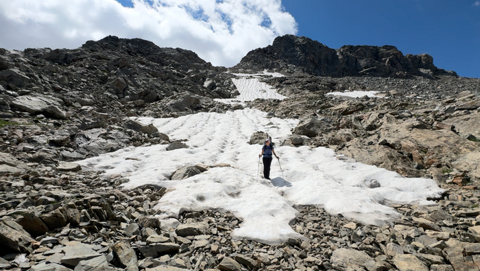 Мы спускались по ледникам, затем – огромным валунам. У озера Сапожок (раньше его называли Верхняя Запятая) покидались снежками, но отдыхать не стали – непонятно, что со спуском дальше.
