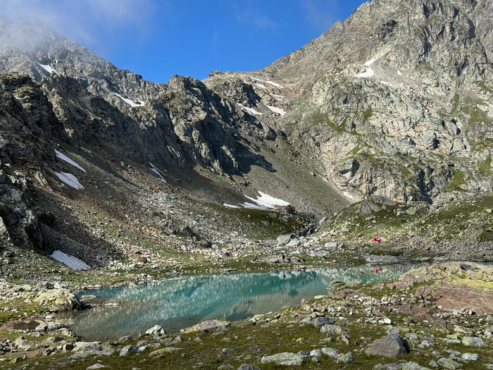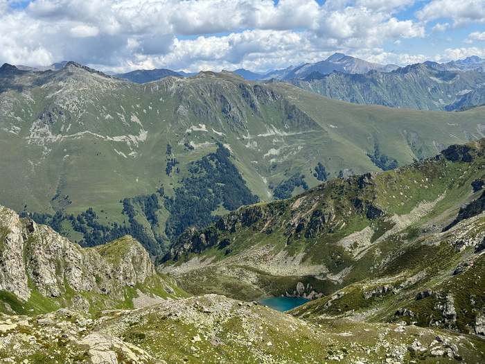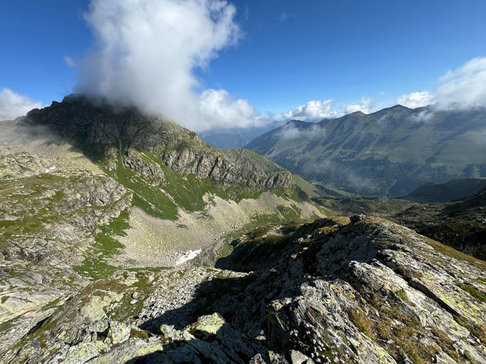 Навстречу нам попались две нерадужные группы туристов. Мрачные, уставшие. Я внутренне радовалась: а мы все трудное уже преодолели, у нас теперь красота и сплошное наслаждение. И мы наслаждались: Кавказским хребтом, озером Айматлы внизу, изрезанными долинами, причудливыми скалами и снежниками. Никакие фотографии и видео не передадут того особого чувства, что охватывает тебя в горах: счастья, единения с природой, величия, восторга, легкого страха и ощущения того, что это вокруг – весь мир, и весь мир – это ты. Вписываешься во все это величественное и растворяешься в нем. Магия места.