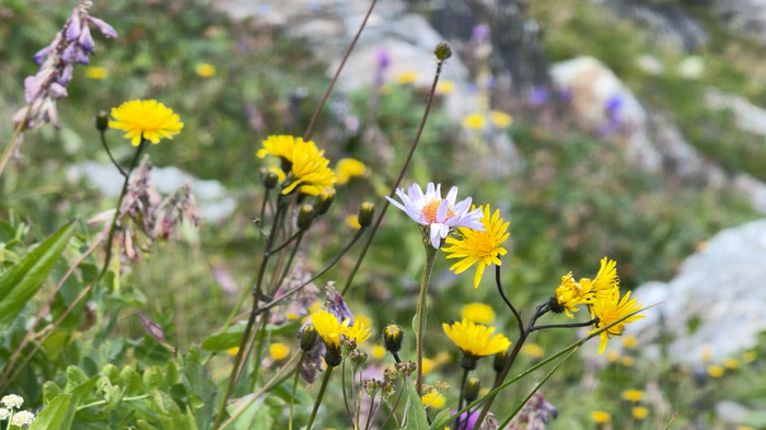Вот они, обещанные интернетом альпийские луга. Да в гробу я видала такие луга! Луг для меня – это ровная поверхность. Альпийский – еще и в зеленой траве с цветочками. А не травянистая гора, крутая, высокая, сыпучая, спуск боком, по шажку, мееееедленно, палки упереть не во что, а по краям, действительно, и рододендроны, и малина – только ее даже никто не ест, сил нет. Муторно, колени отказываются разгибаться, так и идешь на полусогнутых, меняя опорную ногу.