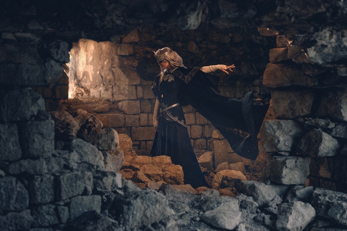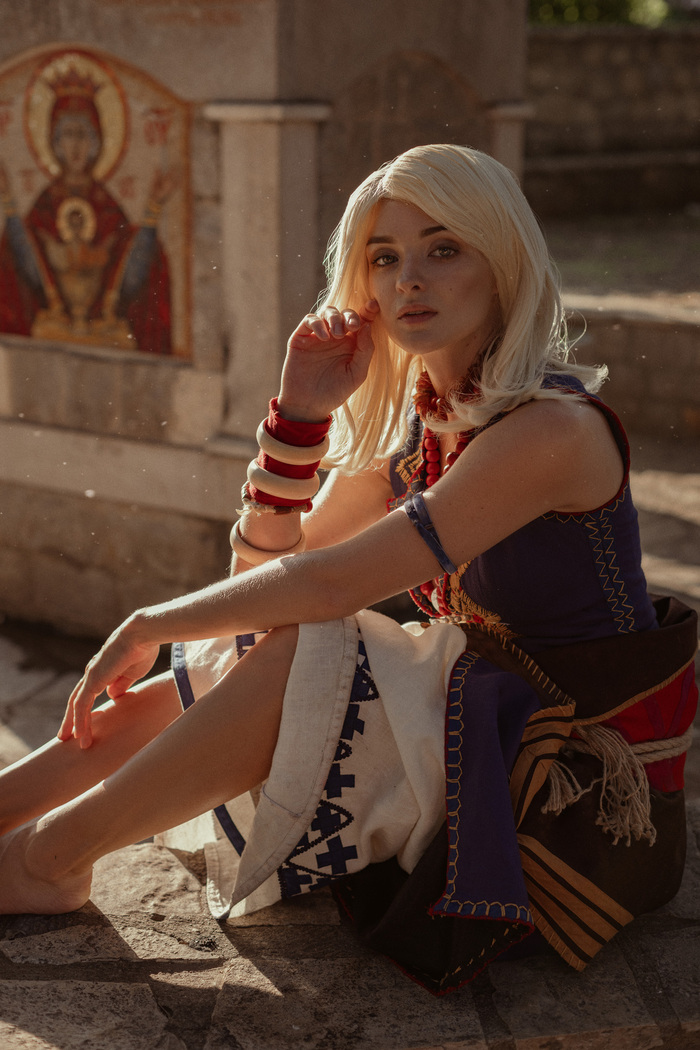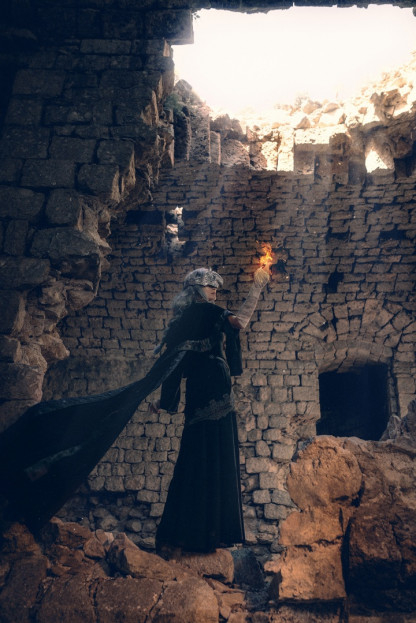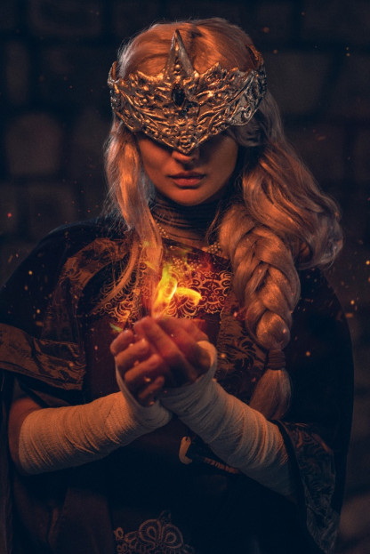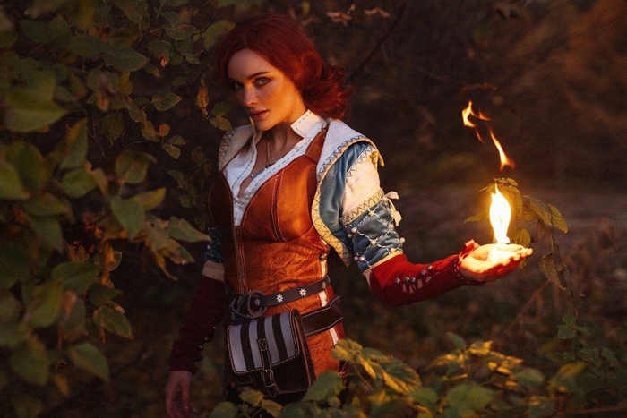 Косплей на Трисс Меригольд из игры "Ведьмак" с использованием настоящего огня