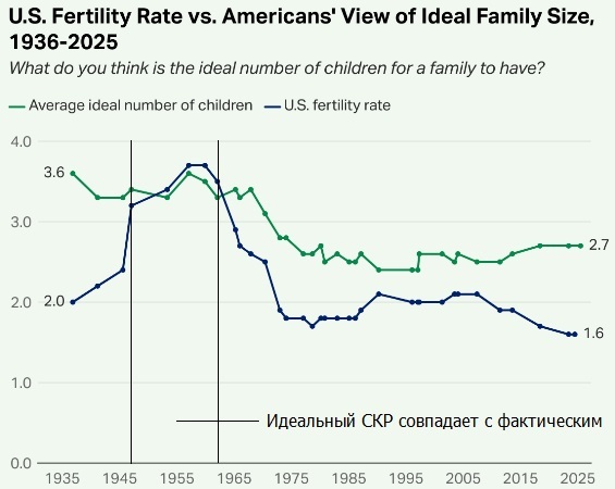 Ещё хочу обратить ваше внимание на любопытный феномен. С начала 1970-х годов среднее идеальное число детей в семье колеблется в диапазоне 2,4-2,8 (идеальный СКР), но фактический СКР гораздо ниже - 1,9-1,6 (уровень вымирания). Причём в период с конца 1940-х до начала 1960-х идеальный СКР совпадал с фактическим (примерно 15 лет; 1947-1962). Затем систему перестроили так, что американцы больше не могут достичь идеала в области размера своих семей. Напомню, именно в начале 1960-х запустили феминистическое движение и сексуальную революцию.