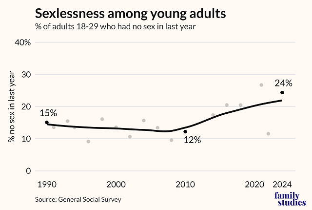 В период с 2014 по 2024 год доля молодых людей в возрасте 18-29 лет, сообщивших о проживании с партнёром в браке или сожительстве, снизилась на 10 процентных пунктов - с 42% до 32%. В два раза выросло число молодёжи, не имеющей полового контакта в течение прошедшего года: 2010 год - 12%, 2024 - 24%.