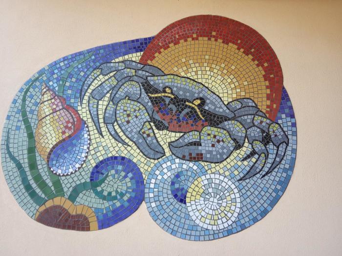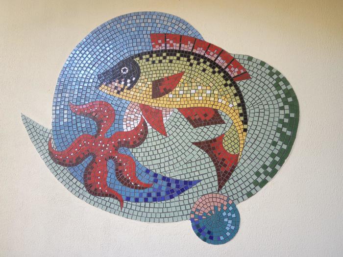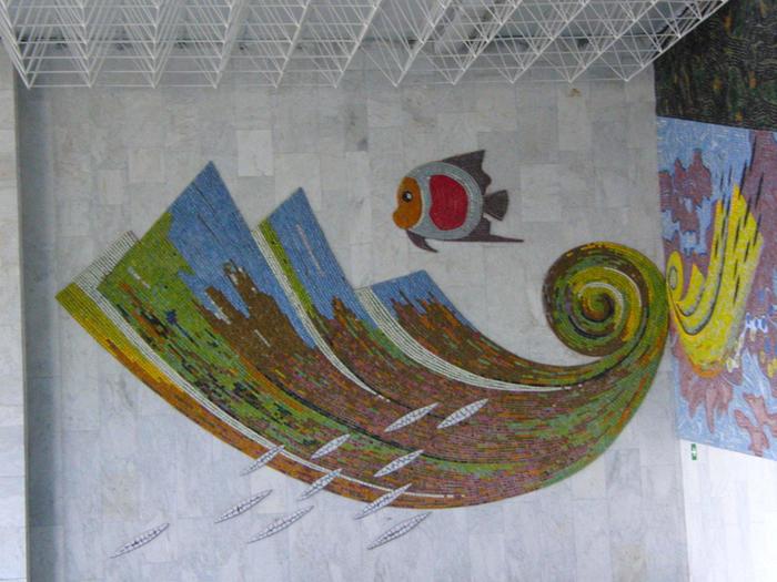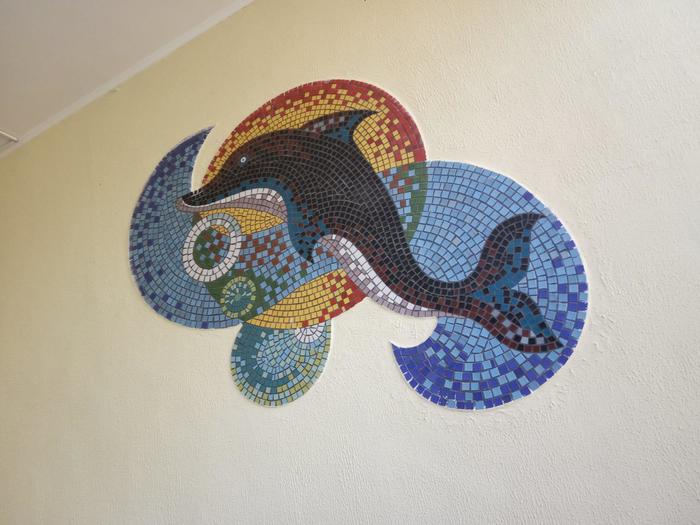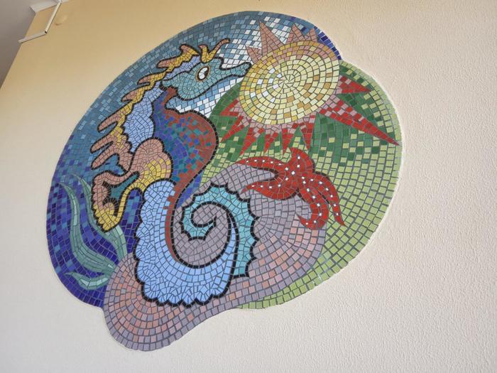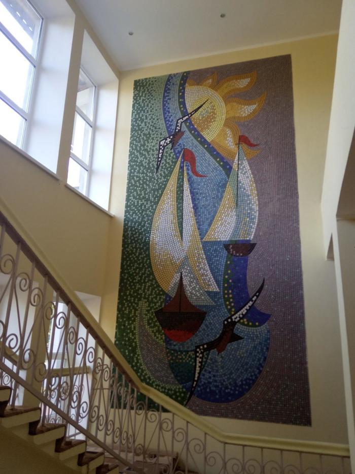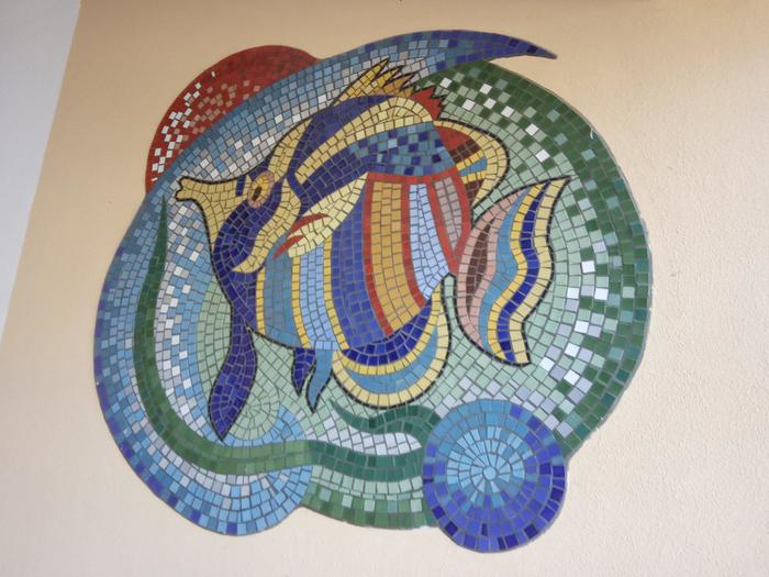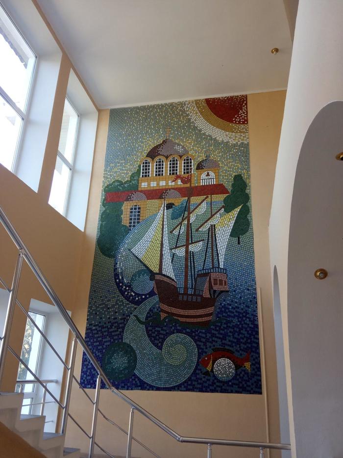 Мозаика из плитки, вид города, морская тематика и морские обитатели. Новые корпуса в санатории Дружба, Евпатория