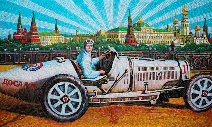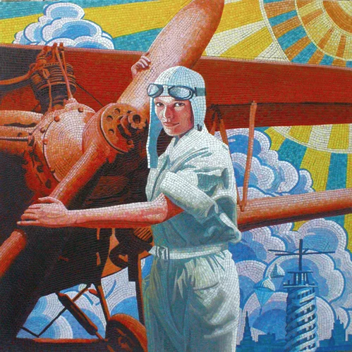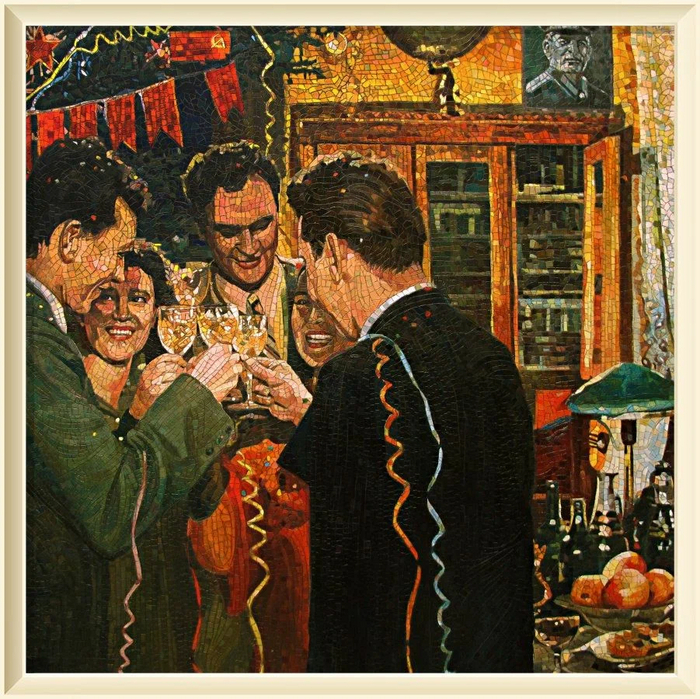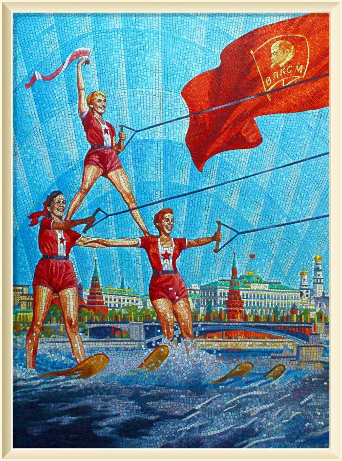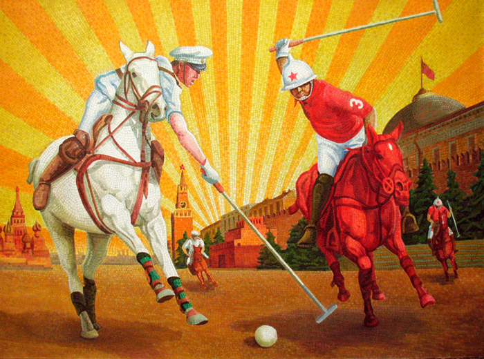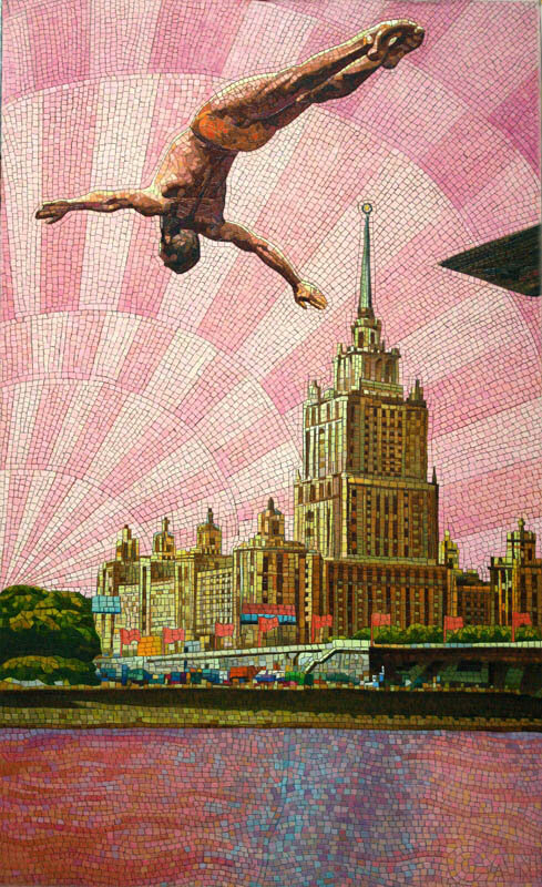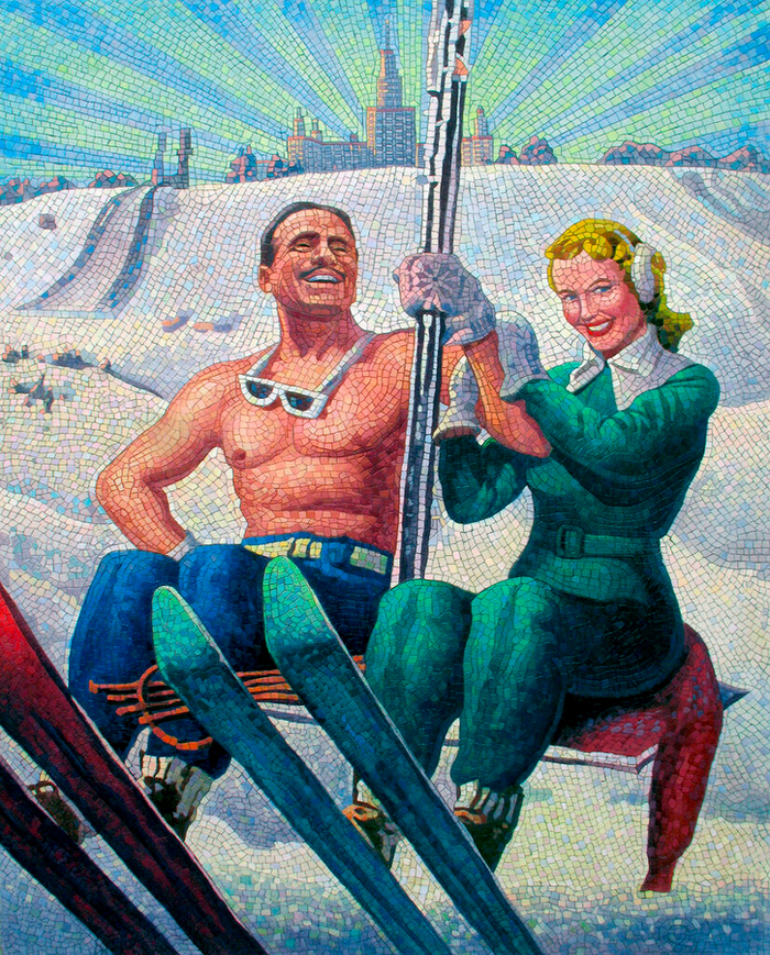 Серия работ Анатолия Ганкевича напоминает яркие монументальные мозаики московского метрополитена, монументализм ВДНХ, счастливые лица людей , улыбавшихся с советских плакатов. Эффект достигается удачной композицией и яркими красками.
