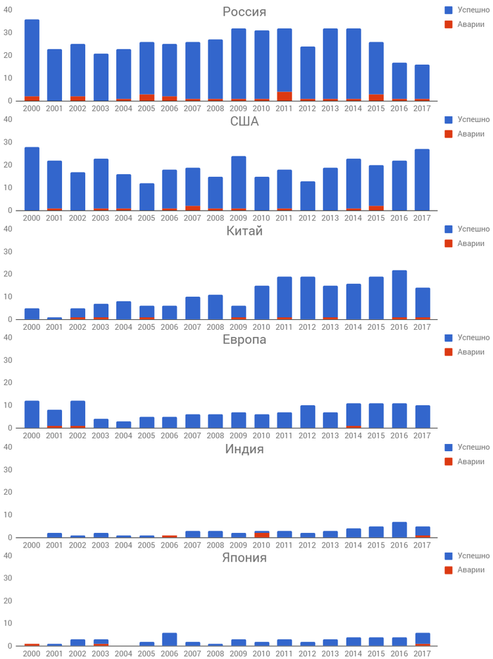 Серьезный провал у нашей космонавтики был в 2011 году, когда из 32 пусков было 4 аварии. Тогда представители Роскосмоса, отчитываясь за провал пуска автоматической межпланетной станции “Фобос-Грунт”, оправдывались (https://www.vedomosti.ru/politics/articles/2013/08/05/rsokos...) сокращением штата военной приемки, и череда ракетных аварий как бы подтверждала их слова.