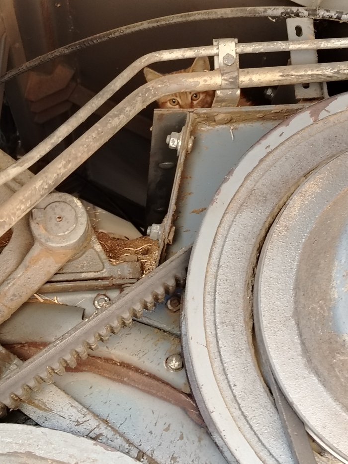 Залез котик под бункер, хорошо я его услышал, если б молотилку включил, испугался бы, побежал и попал бы или под ремень или под цепь! Вопщем такие дела.