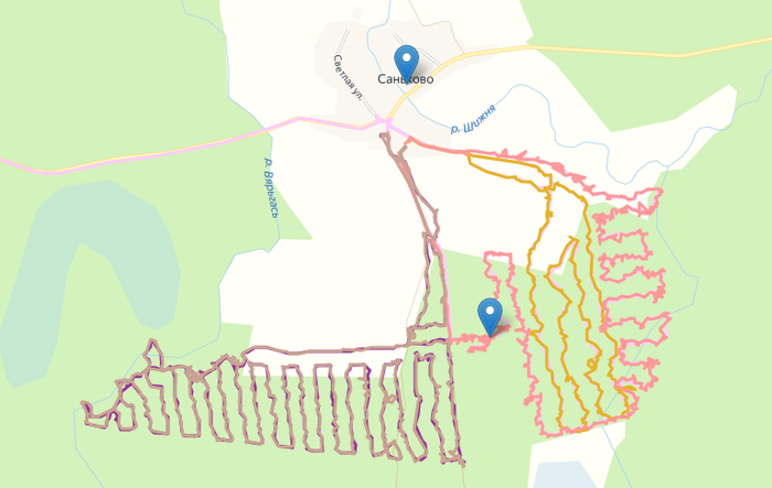 Карта поисков. Рыжий цвет - задача, выполненная Тайгером. Розовый - маршрут с Черри. Бежевый с фиолетовым - отработала другая группа кинологов.