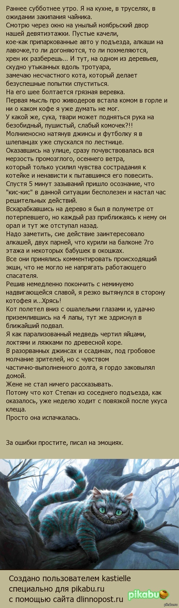- Дама, - сказала она, - Во-первых, обещайте, что Вы не полезете за котиком сама, иначе нам и правда придется приехать, и не одним, а со скорой помощью. Договорились? Теперь слушайте: берете флакон валерьянки и выливаете на ствол дерева на высоте вытянутой руки. ВСЁ.