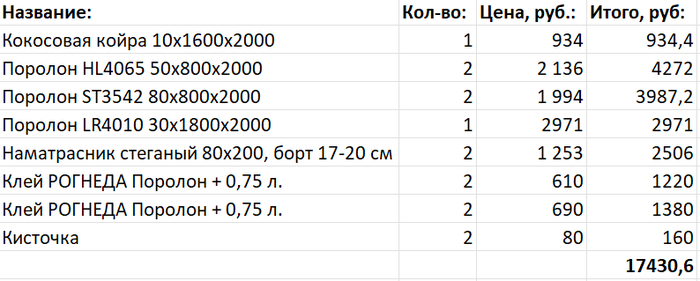 Кокосовую койру и поролон ST3542 покупал у дилера производителя поролона, в моем случае это ФоамЛайн, так получалось дешевле. Остальные тоже получались дешевле, но они не ходовые товары и продавались только оптом, поэтому остальное заказывал на озон, вайлдберриз.
