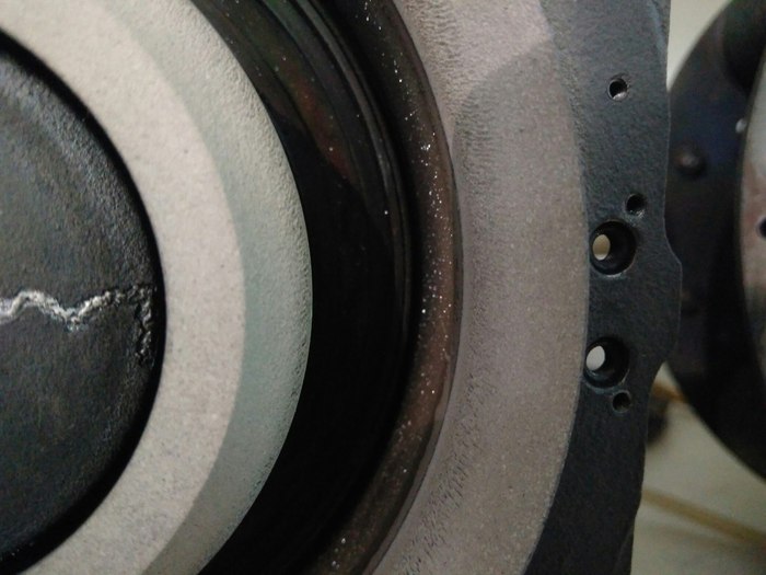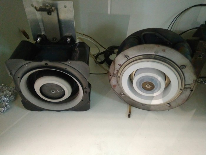 Вот два двигателя. СПД-100 слева и СПД-85 справа. СПД-85 еще не работал вообще, а СПД-100 отработал уже около 4000 часов. Видите, на СПД-100 на срезе керамика белая а внутри черная? Это называется граница зоны эрозии, там где керамика белая, ее срезал поток плазмы.