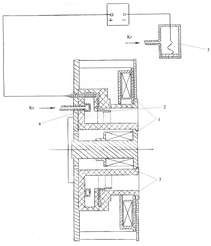 Тут все просто. Между анодом и катодом включается источник питания заданной мощности (он называется разрядным). Следствии чего внутри канала (этот зазор между кольцами 3) появляется продольное электрическое поле (рисовать лень, просто представьте пучок прямых линий от точки 2 к срезу справа).
