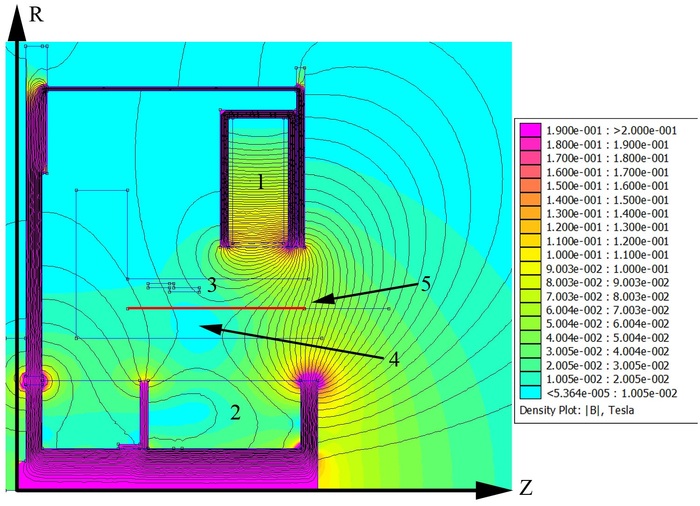 1, 2 - магнитные катушки, 3 – анод, 4 – ноль поля в канале, 5 – Максимум поля на срезе канала