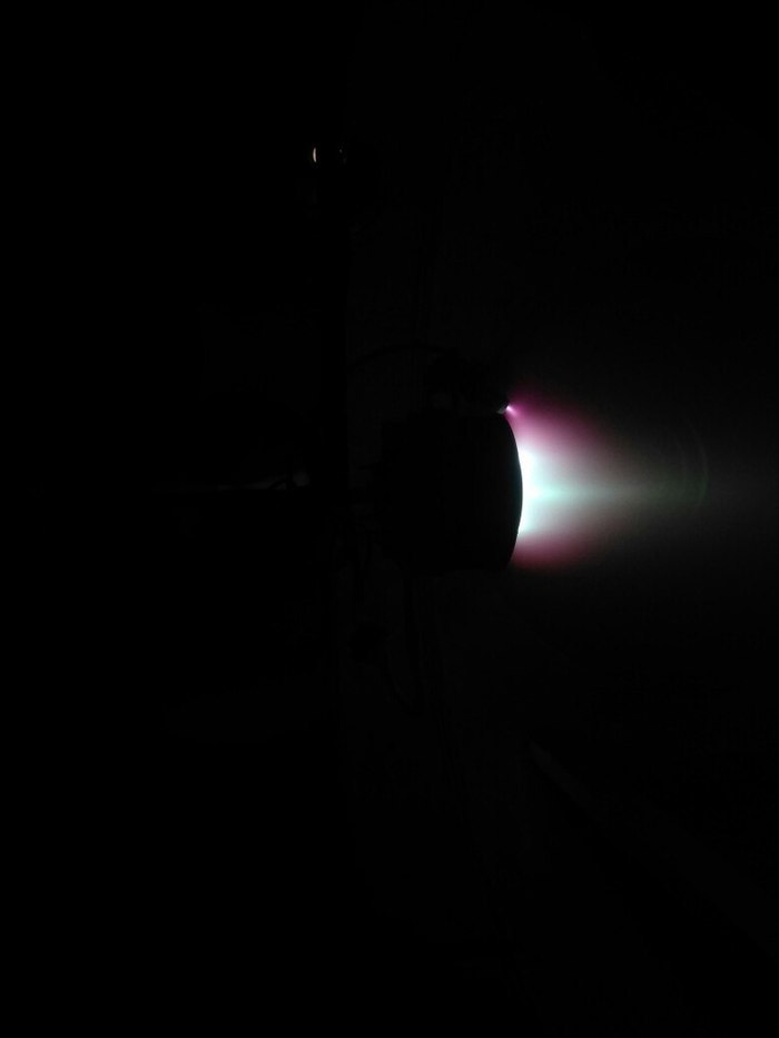 Мощность до 6кВт, Удельный импульс тяги (скорость истечения струи) до 18 км/с и КПД до 40% (при работе на ксеноне). выглядело все примерно так: (срез двигателя справа)