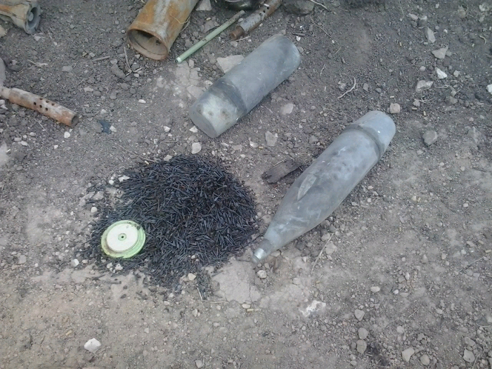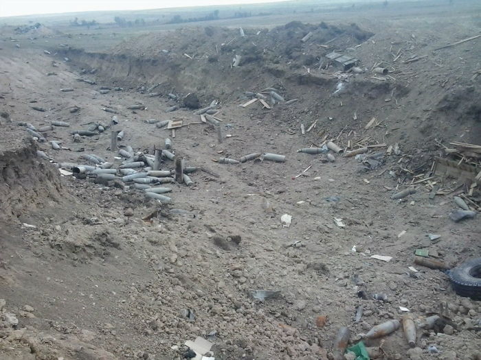 Вот брошенные позиции украинской артиллерии. ЛНР. Лето 2014-го года. Среди разбросанных 122-мм снарядов для Д-30, можно заметить кучу тех самых флешетт.