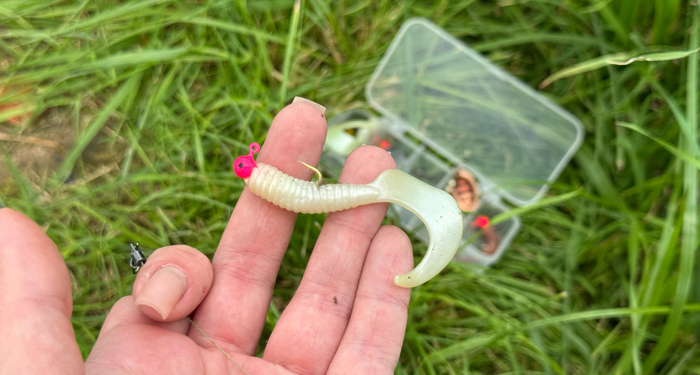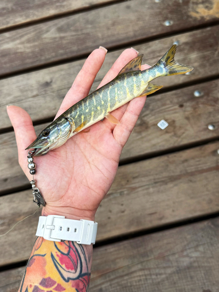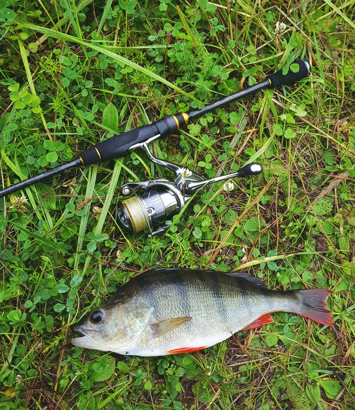 Сели мы сидеть около 3-х часов дня. Так как я спиннингуй, то если не клюет первые полчаса - надо делать перезаброс или менять наживку. Фидеристы могут же сидеть часами и это нормально. Так что я очень быстро отделилась от своего напарника и пошла изучать водоем. По информации в нем есть щука, около 600кг суммарного веса. Походила, покидала всякого разного - результата 0. Возвращаюсь в лагерь, а у напарника уже первый улов. Спустя 2 часа с начала рыбалки в подсачеке оказалась первая свинюшка.