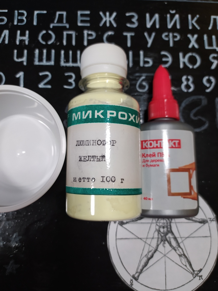 Но не хватало мистики... Решил взять люминофор. В месте с клеем ПВА замешал его в миске из под соевого соуса.
