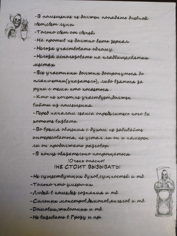 Ну и конечно же инструкция. Смотрел в интернете, не нашёл. Взял из пары ужастиков, и сайтов с магическими ритуалами. И наклеил на обратную сторону доски.