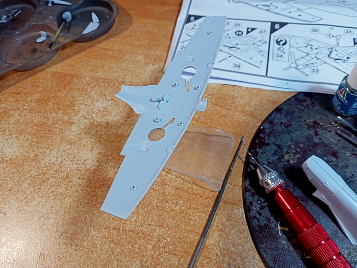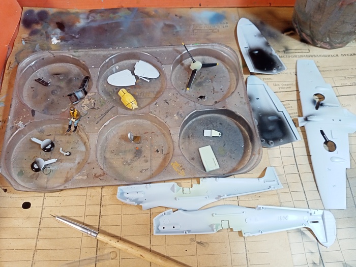 О создании: Работал я с этим набором по своей любимой схеме для простых моделей. Сначала абсолютно ВСЕ детали отделены от литников, зачищены, где нужно доработаны (рассверлены стволики пушек в обтекателях, сделана фрезером проточка в воздухозаборнике маслорадиатора и т.д.), собраны некоторые узлы.