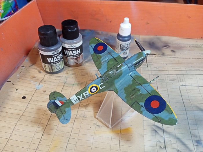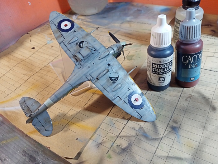 Поскольку модель и так не идеальна, на ней я решил побаловаться с грязью, нагаром, и прочим обгадингом. Представим так: наш Спитфайр видел некоторое дерьмо активно сражался в небе над Европой, летал сквозь столбы и клубы маслянистого дыма, стрелял из всех орудий, коптил движком на форсаже, а потом ещё и усталый садился отдохнуть на грунтовые аэродромы. А у техников времени-то и было только залить горючку и зарядить ленты в ящики, в общем не до косметики. Начнём с акриловых смывок Vallejo Wash. После высыхания растушёванных потёков, задуем модель полуматовым лаком. Вообще на фото Спитфайры очень даже блестят, но наш такой весь грязный ветеран, что чистый глянец будет смотреться нелепо.