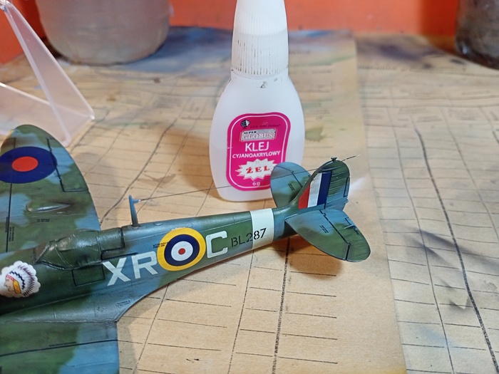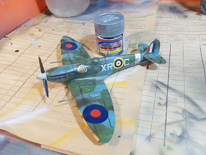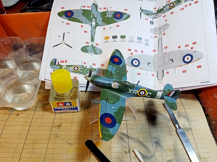 О наборе: Набор 2014 года от английской фирмы Airfix. Звучит очень солидно, не так ли? К сожалению, в этой фразе есть пара нюансов. Эйрфикс, безусловно, фирма английская. Но вот на коробочке есть небольшая надпись Made in India, то есть сделан набор не в метрополии, а в колонии (или я ошибся на век-другой, используя такие термины?). По году тоже всё не так гладко. В 2014 году набор прошёл обновление, был укомплектован новыми декалями и инструкцией. Пластик остался прежним, с клеймом "1974", что как бы намекает. А вот сайт Scalemates утверждает, что ноги набора растут ещё из 1955 года, не знаю правда ли это. Как бы там ни было, перед нами типичнейший пластик старого образца со всеми вытекающими. Относительно недавно работал с подобным обновлённым раритетом - Макки Саетта от Revell, впрочем Спитфайр получше. В аккуратненькой коробке лежат: четыре литника из светло-серого полистирола, литничок из прозрачного с фонарём кабины и габаритным огоньком, большая декаль и инструкция. В наборе 35 деталей (и это не упрощённая сборка!), от 2 до 4 штук останутся неиспользованными. Качество литья плохое, может служить наглядным примером по дефектам литья. Вот у нас следы стыковки пресс-форм, а вот это - облой, а это - небольшие утяжины. На крыльях и фюзеляже можно увидеть какие-то шероховатости, некоторые мелочи замылены - признаки усталости старой формы. Сам пластик вполне хороший, нормально обрабатывается, не хрупкий. Прозрачные детали - на уровне советских перепаков Фрога - толстые, кривые, плохо стыкуются, имеют только намёки на переплёт. Неприятно было подгонять стекляшку на габарит - она размером меньше бисеринки, а её надо обточить! Детализация не так плоха: есть несколько мелких деталей, худо-бедно, но символически показан интерьер кабины - с таким стеклом могли не заморачиваться. В наборе имеется удивительно хорошо проработанная фигура пилота, других бонусов нет. Расшивка чисто символическая, смешанного типа - внутренние щели отклоняемых поверхностей и стыки носовых листов чередуются с наружными танковыми заклёпками и стыками прочих листов. Очень грубо показан рельеф оперения. Очень многих лючков, которые показаны в инструкции, на модели нет. Стыкуемость ниже среднего, но не совсем днище. Щелей в палец вы не увидите, однако имеются перепады на стыках деталей, почти всё требует подгонки. Набор имеет вариативность по сборке в виде выпущенного или убранного шасси. Поскольку ниш шасси в принципе нет, есть лишь крепёж для стоек, я делал летящий Спитфайр. К тому же, он так занимает меньше места и более наглядной становится аэродинамичность его обводов. Инструкция старого образца, но крупная и понятная. Плохо то, что не указаны названия цветов, только номера красок Хамбролл. А вдруг меня в Гугле забанят, как я тогда узнаю, во что красить интерьер?! Схемы окраски цветные, показывают самолёт со всех ракурсов, тут всё очень хорошо. Предлагаются два варианта с одинаковым двухцветным камуфляжем - один чисто английский, с индейцем на капоте, второй с американскими опознавательными знаками, но всё равно воевавший в Англии. Декаль - самая современная и качественная часть набора. Мало того, что сами декали красивых цветов, не прозрачные, тонкие и прекрасные в работе, так тут ещё имеется множество технички - элементов 50, не меньше! Как я уже писал: в инструкции нарисован лючок, на который нужно разме