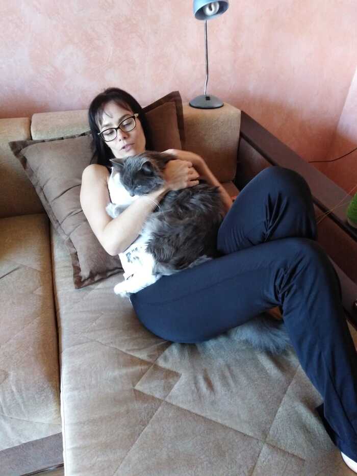 А мне не всегда хочется чесать его, поэтому я ложу на живот вязание и говорю котику, что мол место занято, кофта тут лежит, надо ее довязать.