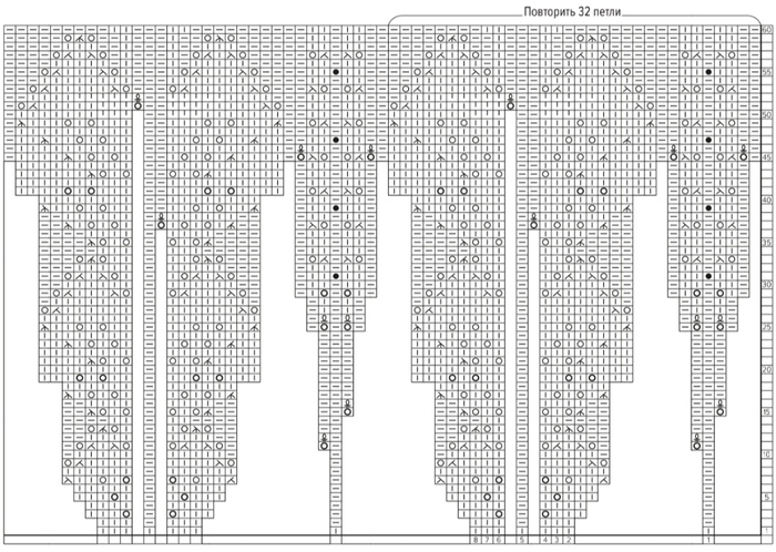 Как вы видите на схеме раппорт начинается из 8 петель, а к 60 ряду петель уже становится 32. Где и как полотно расширяется хорошо видно на схеме. Если кто не замечает как, задавайте вопросы в комментариях.
