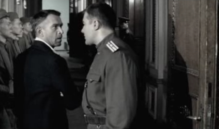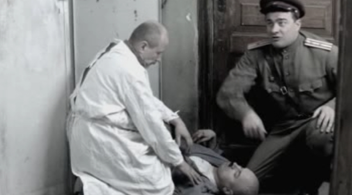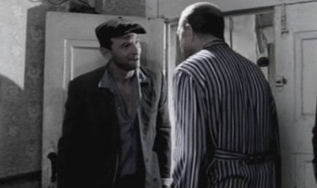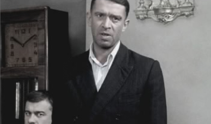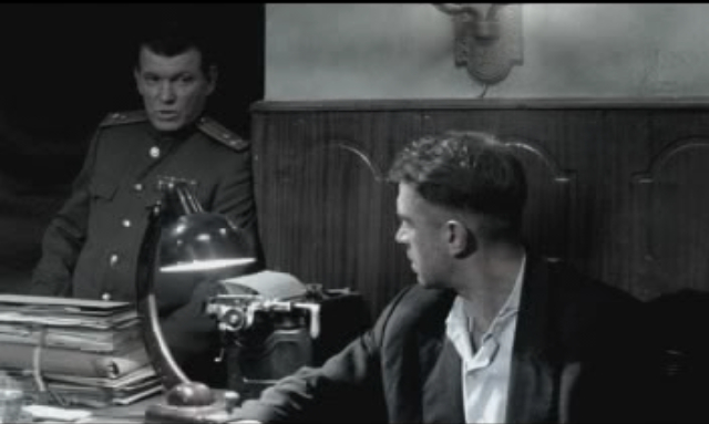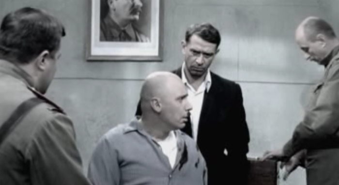Ну а потом Кречетов допрашивает караульного Охрятина. Караульный утверждает что он никуда не уходил, никто не приходил и он никого не видел. Проходил мимо только врач Арсенин, который искал Гоцмана . Так же Охрятин утверждает, что Родя немного постучал а потом успокоился, хотя по идее когда Родю душили, он должен был колотить ногами по дверям железного шкафа как сумасшедший, и там бы стоял сильный грохот. Ну а Гоцман осматривает шкаф и ищет хоть какие то зацепки.