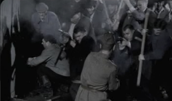 Якименко рассказывает с чего все началось:-Этот поц подошел, постучал условным стуком. Мы выждали, пока замок завертелся, и кинулись. Так поц успел со страха крикнуть. И Чекан, прямо через дверь, шмальнул два раза. В него попал и Довжику досталось.
