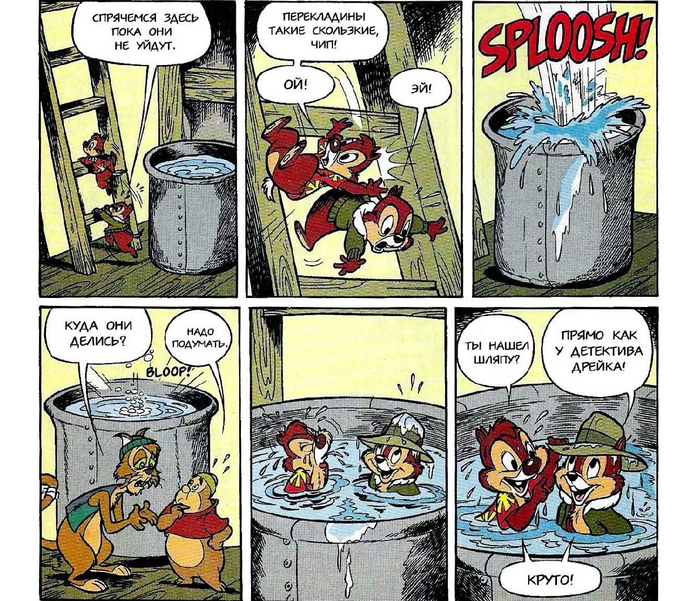 Синтез классических короткометражек и CDRR. Не то чтобы нам прямо об этом говорят, но упомянутый клуб «Жёлудь», это прямая отсылка к короткометражке «Соперники», более того рассмотрите внимательно 6 страницу, ту, где Чип и Дейл играют на музыкальных инструментах, это те самые инструменты, на которых они играли в ней.