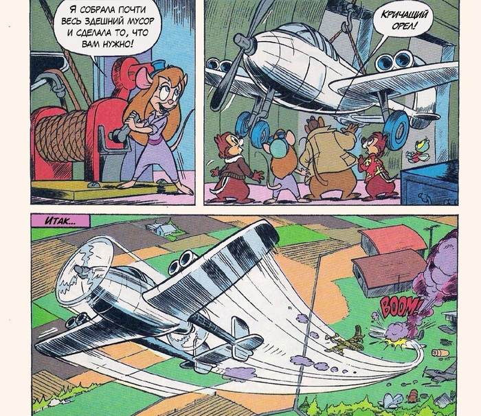 Во-вторых, в комиксах Брилла, как мы говорили акцент был на персонажах Чипа и Дейла, но оставалась ли та история историей о спасателях? Да, свои моменты славы были у всех, а герои активно участвовали в каждом событии, они были у дела и к месту, в то время как Фишер, и он сам это признавал, хотел рассказать историю отношений Гайки и Чипа, то есть написать фанфик про них, другие герои часто чувствуются инородно, они лишние, чёрт это произведение про спасателей, в нём 233 страницы, из них около 170 – посвящены только Чипу и Гайке.