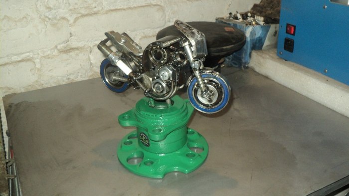 Пришел заказчик и сказал , что хочет спортбайк на пьедестале. А надо сказать спортбайки делать из мусора самое сложное для меня,слишком плавные линии, я больше по чепперам. Но хозяин барин , пришлось из остатков скутера, пары свечей от авто и ступицы колеса (неизвестной мне машины) сделать мотоциклет. Который теперь радует владельца и его посетителей.