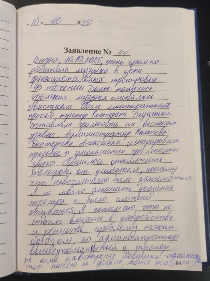 Но вот 10.10.2025 в 19:00 в зоне функциональных тренировок началось групповое занятие у Екатерины Саушкиной. Я в это время была на встрече и в шумоподавляюших наушниках, но слышала звуки музыки даже через них. Встреча закончилась и я сняла наушники и была в шоке. Рядом с тренажёром, на котором я выполняла упражнение, висела колонка, из которой очень громко доносились жуткие каверы на популярную музыку, сменявшиеся каждые 20 или 30 секунд громким свистком. Как я понимаю, музыка для интервальных занятий. Соответственно, заниматься было не комфортно, услышать своего тренера - просто невозможно. Девочки, с которыми я вместе занимаюсь, поступили по-разному: кто-то ушел подальше от звуков на другие тренажёры, а кто-то просил тренера сделать потише. Мой тренер просил Екатерину сделать потише. Но она просьбы игнорировала. Люди подходили к управлению звуком и делали тише, тогда Екатерина снова делала громче, чуть ли не больше, чем было до этого. Тогда я решила обратиться за помощью к администратору, раз уж тренер ведёт себя так эгоистично и не уважает клиентов клуба и просто людей, которые находятся с ней рядом. Администратор мне сказали, что вот уже подходили, жаловались и она решает вопрос. Прошло примерно минут 10-15 после моего похода к администратору, время 19:30 а музыка как была очень громкой, так и осталась. Тогда я решила взять дело в свои руки и вытащила шнур-переходник между телефоном и колонкой, потому что никто на ситуацию не реагировал и персонал в лице Екатерины и администрации дружно игнорировал просьбы и клиентов зала, и своего коллеги -тренера. Естественно, после этого Екатерина Саушкина начала истерику и требовала вернуть ей переходник. Я сказала, что отдам, если она сделает музыку тише. Это был на мой взгляд единственный способ привлечь внимание к дискомфорту окружающих, который эта дама создала. На что её реакция была следующей: она побежала к администратору и требовала расторгнуть со мной контракт, вызвать полицию и сфотографировала меня без моего разрешения. Только до этого она пыталась администратора увести в каморку, чтобы обсудить проблему уже без меня. Я настояла, что хочу участвовать в обсуждении. Далее администратор повела себя тоже, как и тренер, непрофессионально. Она начала истерить, как вы могли такое сделать и вообще всем было нормально, кроме вас и вашей подруги. И вообще по правилам клуба тренер может ставить любую музыку, какую он хочет и на той громкости, какой хочет. Мы менять не можем. И никто не может. И вообще, вы тоже можете прийти в клуб, включить на полную громкость свою колонку и тренироваться. Я была шокирована и попросила жалобную книгу. Тренер и администратор отказались назвать свои фамилии. Фамилию и имя тренера я нашла в приложении по расписанию и по списку тренеров. После многочисленных просьб администратор тоже сообщила свои данные - Валенова Екатерина Алексеевна. Не знаю, свое ФИО она назвала или нет, потому что у нее не было бейджа, а только белая футболка с логотипом зала. На все претензии далее она говорила и повторяла много раз - если вам что-то не нравится, то могу дать вам заявление на расторжение договора прямо сейчас. На моё заявление, что она работает в области оказания услуг и стоило бы быть более клиентооринтированными, сказала, что они не оказывают услуги. Тут уже без комментариев.