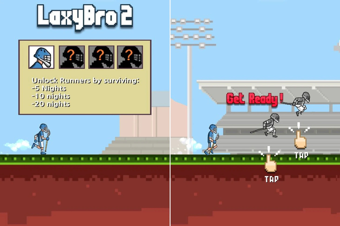 «Нажмите, чтобы прыгнуть! Дважды нажмите, чтобы прыгнуть дважды! Laxy Bro 2 - бесконечный раннер в лакроссе! Разблокируйте четырех уникальных игроков в лакросс! Лидер мирового рейтинга!»