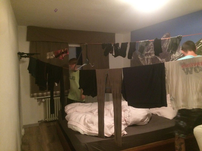 В отель мы заехали спустя 10 минут катания по серпантинам. Нас встретила хозяйка, предложила поставить мотоциклы в гараж и провела в номер. После того, как мы привели себя в порядок, решили устроить большую стирку, раз уж мы сегодня пораньше приехали. В итоге этого мероприятия комната ребят стала выглядеть вот так