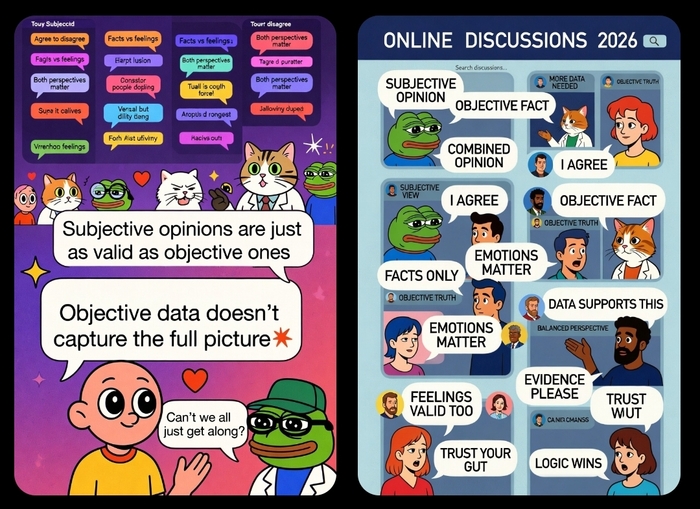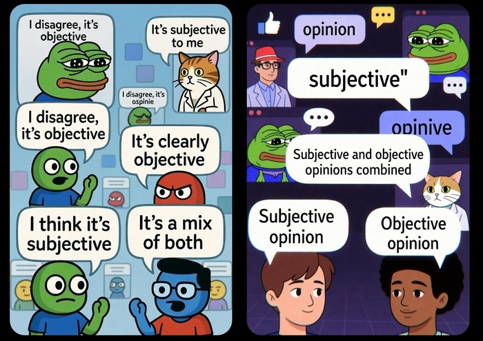 Привет, пикабушники! В комментах под каждым постом — вечный цирк: один кричит «это объективная правда, и точка!», второй — «это моё субъективное, отвалите все!», третий кидает факты, четвёртый — «а я верю, что…». А в итоге все орут, потому что никто не понимает, о чём вообще речь. Давайте разложим по полочкам все эти виды мнений — от древних греков до Канта и современного интернета. Без таблиц, просто текстом, эпично и по-честному.Чисто субъективное мнение — чистые чувства, вкус, личный опыт. Доказать или опровергнуть нельзя.
