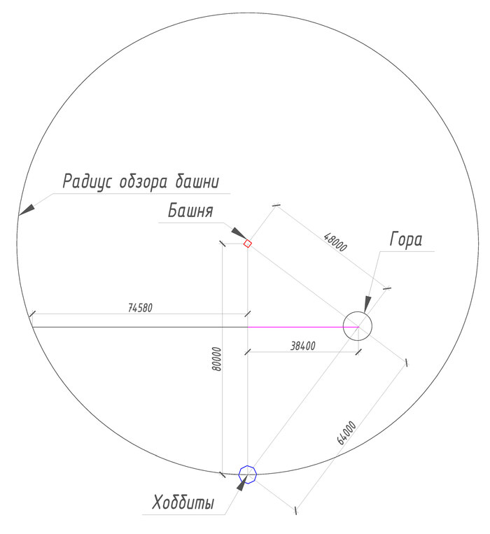 Получается геометрическая задача -имеем 3 вершины треугольника - Башня Гора Хоббиты.И 2 известных расстояния или стороны треугольника - 80км от Башни до Хоббитов и 48км от Башни до Горы,найдём 3е расстояниие найдём следующим образом