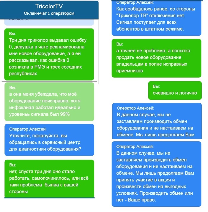 Сразу у сотни человек сломались приемники и возникла ошибка "ноль". В сервисном чате я просил, умолял её переключить меня на техника, а она продолжала убеждать меня в преимуществах нового приемника, в подарок к которым я получал хорошее качество вещания.