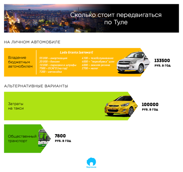 Проехаться на такси от Пушкина, 13 до Пушкинской, 13 стоит 160 рублей в одну сторону, или 320 рублей в день. Это 83 200 рублей в год. То есть даже если наш туляк будет шиковать и каждый день ездить на такси на работу, это всё равно будет дешевле, чем владеть бюджетным автомобилем. Если учесть расходы на такси в выходные, можно округлить до 100 000. Но зачем тогда нужна морока со страховкой, техосмотрами, переобуванием, пробками, поиском парковки и всем прочим, если можно просто всегда ездить на такси и тратить только деньги, а не деньги вместе с нервами и временем? А заодно экономить до 50 000 рублей в год.