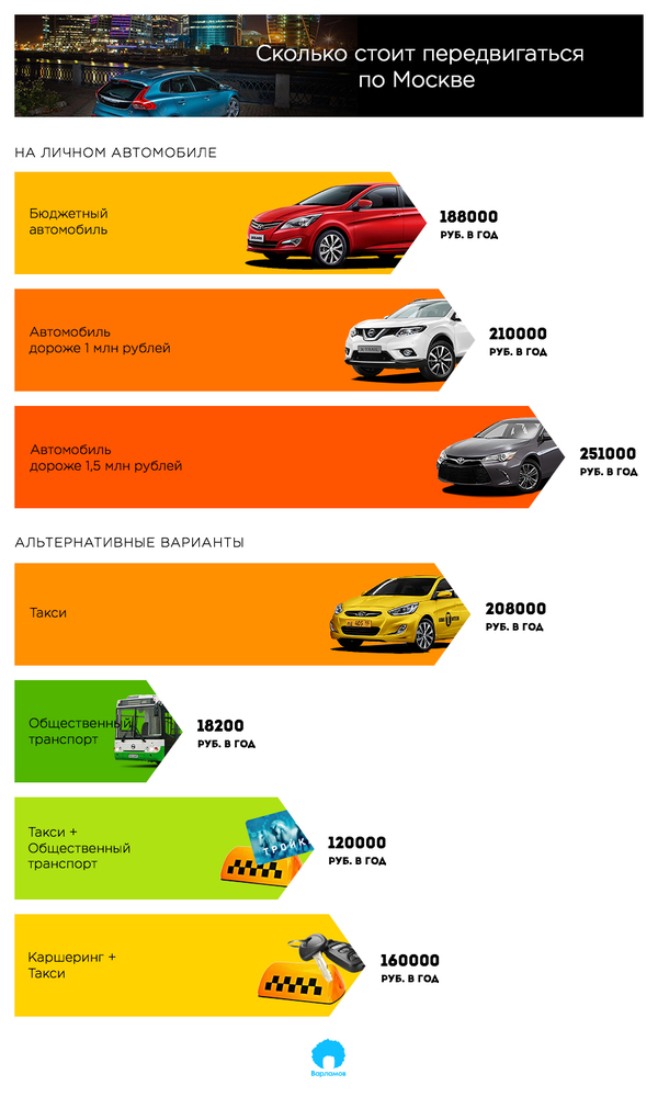 Даже если он каждый день будет кататься на работу и с работы на такси, на это у него будет уходить 4000-5000 рублей в неделю, то есть в год примерно 208 000 – 260 000 рублей. Годовой единый проездной обошёлся бы ему в 18 200 рублей. Если бы он ездил на такси от дома до метро, это обходилось бы ему в 250 рублей в день или 1250 в неделю, в год – 65 000. Суммируем с ценой проездного на метро и получаем 83 200 рублей. Можно округлить до 100 000, если учесть непредвиденные расходы на такси. Можно даже добавить ещё 20 000 на такси в выходные. Получаем 120 000, и всё равно это будет в полтора раза дешевле, чем владеть автомобилем эконом-класса.