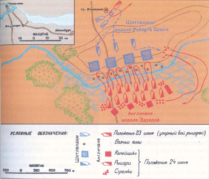 Но в 1314 году он был вынужден выступить в поход для снятия наглой блокады в конец охамевших шотландцев с замка Стерлинг. Гнусненький Роберт Брюс вышел навстречу англичанам.