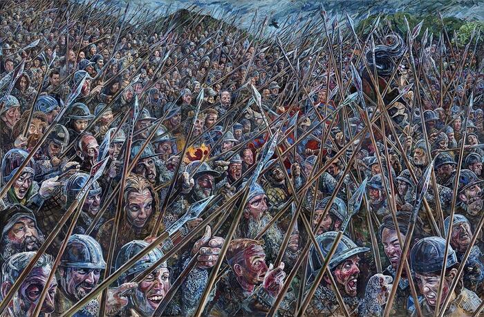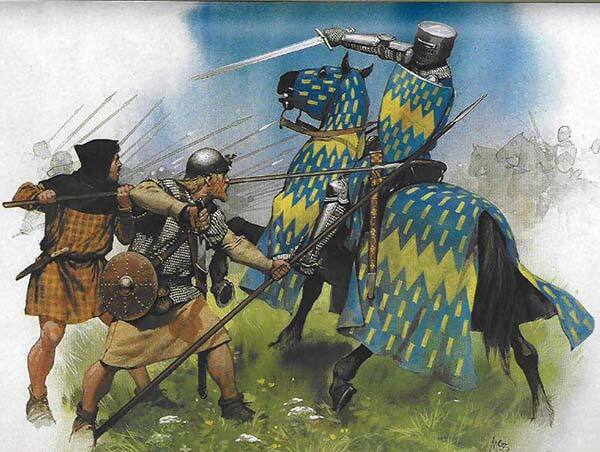 Слева шотландские лоулендеры с пиками, справа английский рыцарь с недоумением на лице, ждет когда они уже побегут прочь в ужасе.