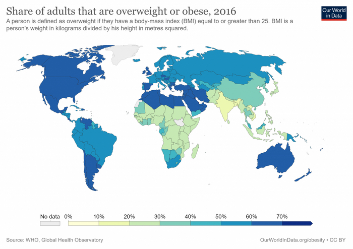 Средние данные — всегда «средняя температура по больнице». Если двое человек недоедают, а у третьего ожирение, то в целом всё вроде бы ОК. К счастью, есть ещё более приближенный к нужному нам результату источник: процент популяции с лишним весом (ИМТ >25) или ожирением (ИМТ >30).
