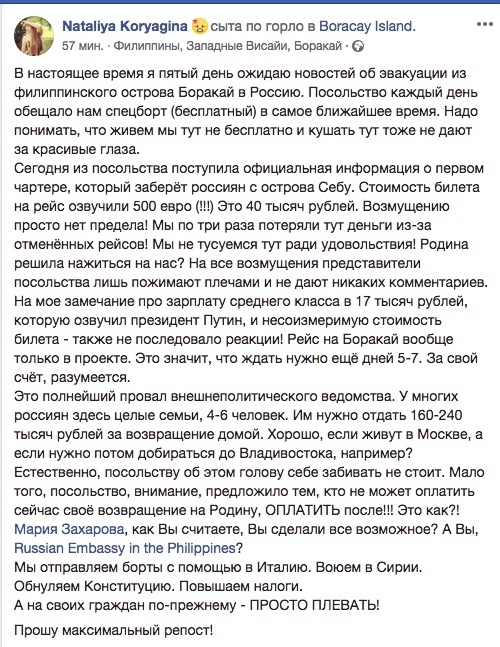 Самое печальное, что после того как они сторговались, мой друг счёл, что информацию о том, что им предлагают буквально "кошелек или жизнь", и предлагает никто иной, как наша родина, смысла распространять нет. Но я другого мнения, я считаю полным пиздецом, что их рейс отменили, деньги не вренули, а хочешь таки вернуться - плати 100 евро. На минуточку, это 8.5к с человека. Т.е. сейчас, это получается 95% месячной зарплаты среднего класса)