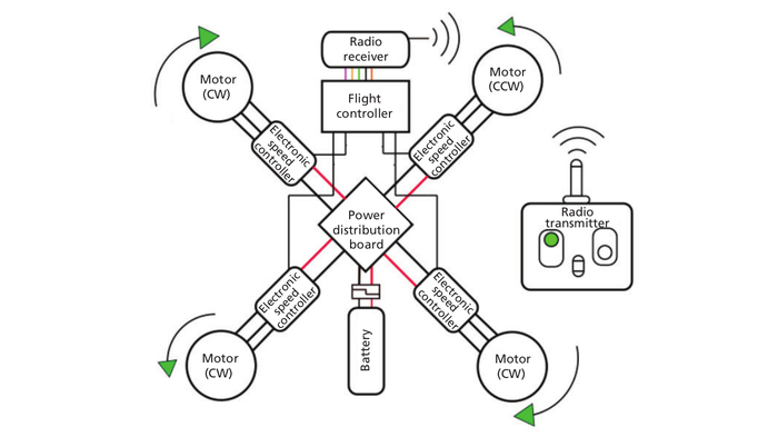 Подавляющее большинство БПЛА коммерческого и бытового назначения, находящихся в свободной продаже или собранные любителями работают на радиоуправлении и состоят из радиоприёмника, полётного контроллера, винтов, батареи и пульта для управления оператором.