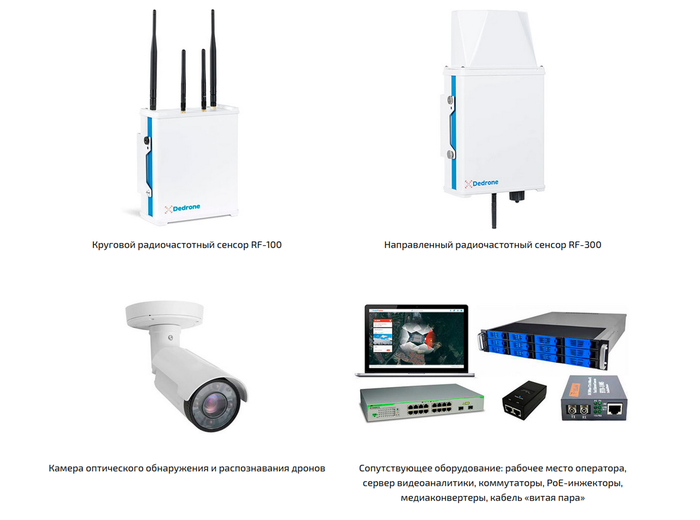 ООО «СД-Техно» является официальным российским представителем немецкой компании «Dedrone GMBH». Для защиты от дронов они предлагают использовать круговые (RF-100) и направленные (RF-300) радиочастотные сенсоры, видеокамеры оптического распознавания коптеров, а также средства подавления. Об особенностях работы системы директор ООО «СД-Техно» рассказывал в нескольких телепередачах на федеральных телеканалах. На сайте компании содержится подробное описание и характеристики модулей обнаружения, однако стоимость изделий можно узнать только по запросу. Оборудование «Dedrone GMBH» работает через облако, при этом цена годовой подписки на начальный модуль радиочастотного обнаружения составляет 8 000 $.