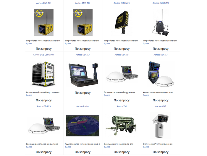 Ещё одним представителем немецких компаний на российском рынке является ООО «Микроэлектроника», она предлагает продукцию «Aaronia AG». Представлен довольно большой набор средств обнаружения (радиолокационные, радиочастотные, оптические) и подавления, для решения практически любых задач. Оборудование Aartos использовалось для обеспечения маловысотной безопасности встреч глав государств стран «Большой семерки». На сайте присутствует подробное описание характеристик и возможностей каждого изделия. Стоимость продукции доступна по запросу. Выступления представителей ООО «Микроэлектроника» в СМИ и интернет-изданиях не представлены, видеоролики иллюстрирующие работу системы обнаружения есть только на youtube канале «Aaronia AG».