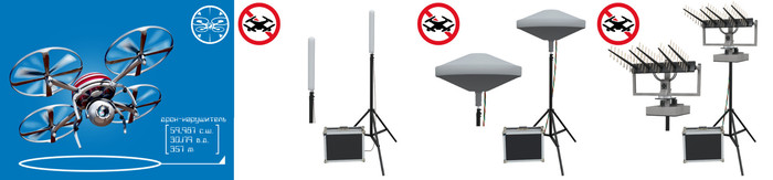 Самыми простыми и надёжными средствами противодействия (по сравнению с орлами, сетками и лазерными пушками) являются радиочастотные подавители, которые ставят помехи в диапазонах работы глобальных навигационных систем, а также каналов управления и передачи данных дронов. Они бывают как узко- так и широконаправленными, могут изготавливаться в виде ружей или стационарных блоков, активироваться вручную или автоматически. Стоимость на такие устройства начинается от нескольких сотен тысяч рублей и зависит от числа диапазонов, мощности излучения, наличия автономного источника электропитания и т.д.