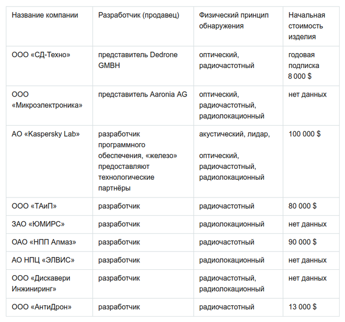 Технологии защиты от БПЛА активно развиваются и совершенствуются, рынок антидрон-систем устойчиво растёт, при этом их стоимость находится в достаточно широком диапазоне. Ниже представлена сводная таблица с перечнем компаний и начальной ценой предлагаемых ими решений.